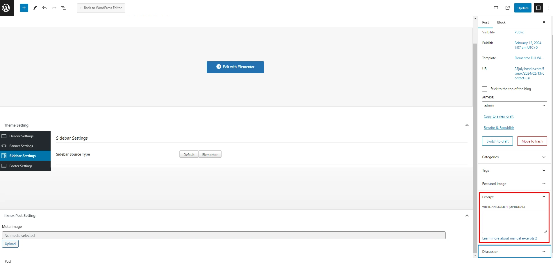 And second one is while editing any post with Elementor, go to the bottom left corner and click on the "Setting" icon. There you will find custom excert field.